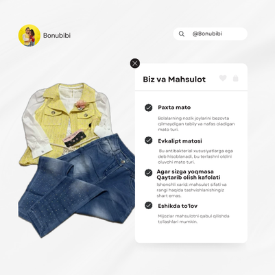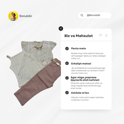 OLDİNDAN BUYURTMA berish xizmatini taqdim etamiz! Bizning oldindan buyurtma bering bilan siz buyurtmangiz eng qisqa vaqt ichida Kelishiga ishonch hosil qilishingiz mumkin. Shunchaki bonubibi mahsulotlariga oldindan buyurtma bering va ularni olib ketish yoki yetkazib berish uchun tayyorlanaylik Sotib olish eskisinden tez ve konumuzda navbat kutmang. Tez va qulay buyurtma berish uchun TeleFon yoTelegram orqali biz bilan bog'laning, biz sizga bugundan buyurtma bering!